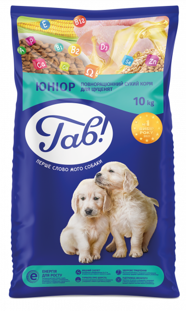 Збалансований сухий корм Гав! для цуценят всіх порід від 4 місяців Юніор - це збалансоване харчування для цуценят, яке забезпечує організм тварини всіма потрібними поживними речовинами: білками, жирами, вуглеводами, вітамінами та мінералами, які є потрібними для повноцінного життя собаки. Комплекс вітамінів і мінералів сприяє зміцненню імунітету собаки, збільшуючи опір організму як до захворювань, так і до негативного впливу зовнішнього середовища. Високоякісний легкотравний білок у поєднанні з вітамінами забезпечує організм енергією, потрібною для активного життя собаки.