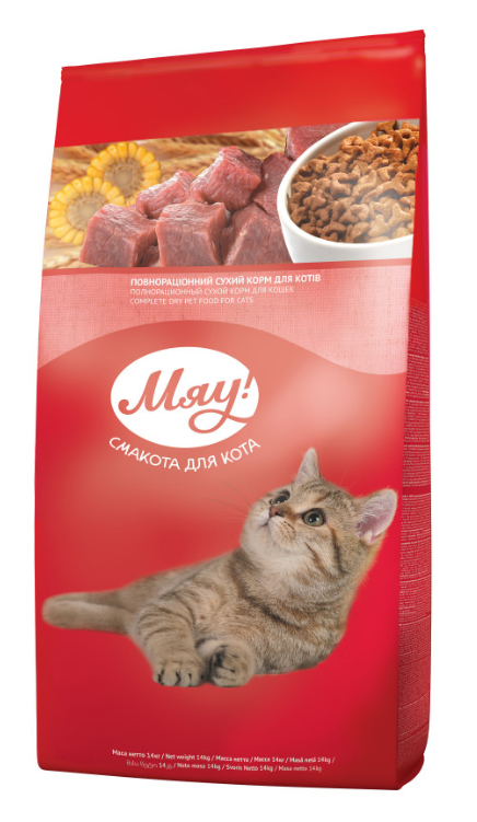 Сухий корм для кішок «Мяу!» – це збалансоване щоденне харчування дорослих котів. Корм збагачений усіма необхідними корисними речовинами: білками, жирами, вуглеводами, вітамінами та мінералами.
