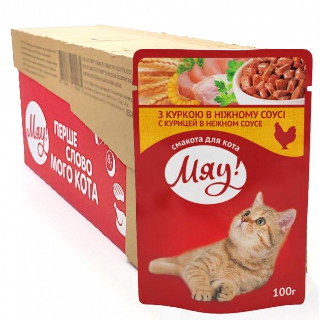 Збалансований вологий корм Мяу! для дорослих котів "З куркою в ніжному соусі" 100 г (блок 24 шт)
