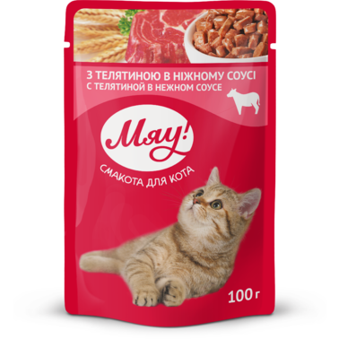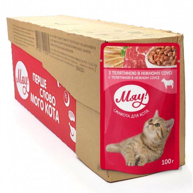 Збалансований вологий корм Мяу! для дорослих котів "З телятиною в ніжному соусі" 85 г (блок 24 шт)