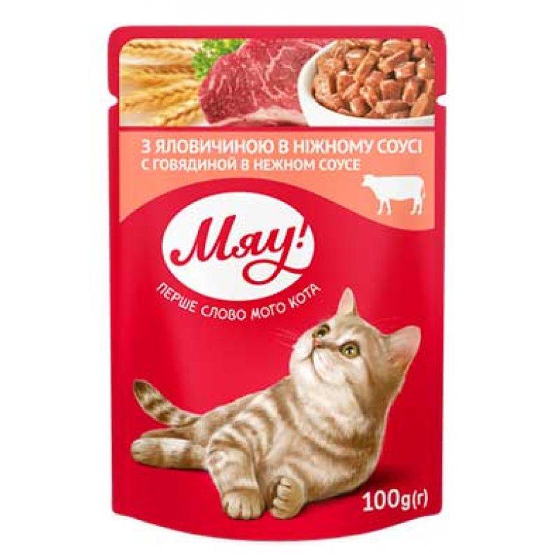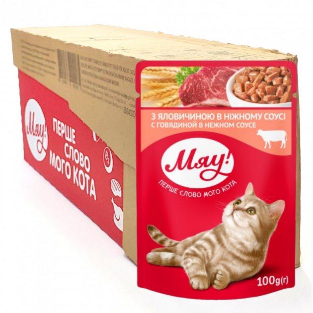 Збалансований вологий корм Мяу! для дорослих котів "З яловичиною в ніжному соусі" 100 г (блок 24 шт)