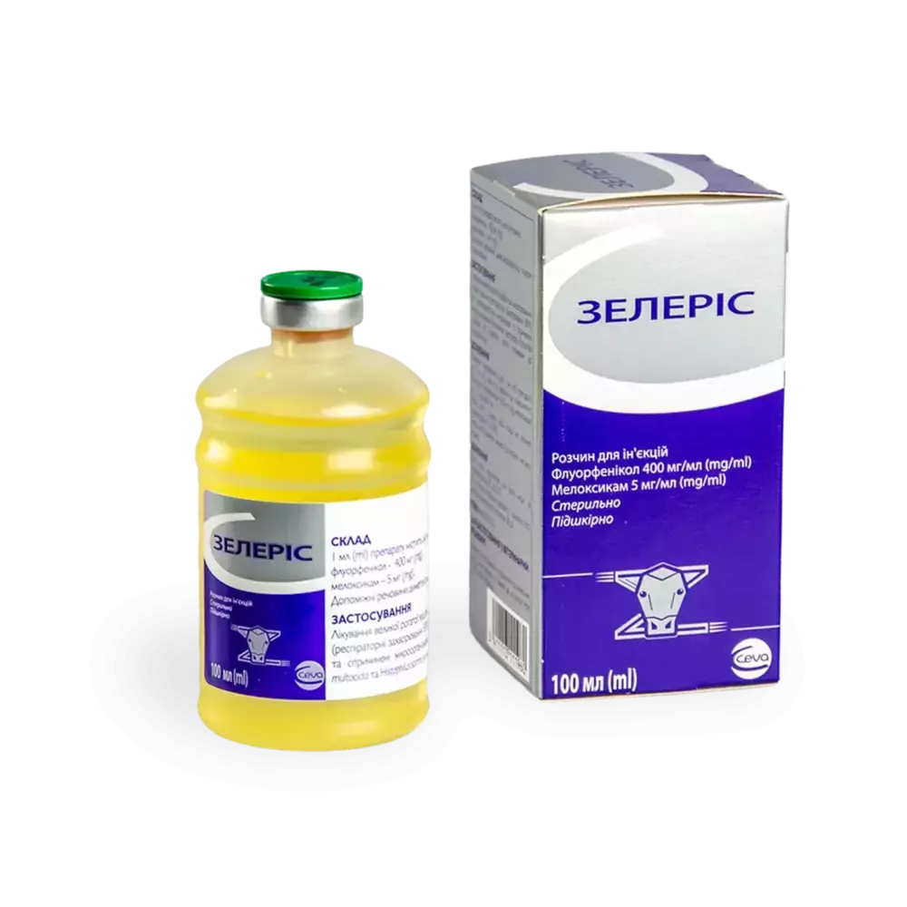 Діючі речовини: флорфенікол і мелоксикам. Фармакологічні властивості Зелеріс є комбінований препарат, що містить синтетичне протимікробний засіб широкого спектру дії флорфенікол і нестероїдні протизапальні засоби (НПЗЗ) групи оксикамов мелоксикам. Флорфенікол, що входить до складу лікарського препарату, має широкий спектр антибактеріальної дії щодо грампозитивних і грамнегативних бактерій, в тому числі основних збудників інфекційних хвороб респіраторного тракту тварин: Pasteurella multocida, Histophilus somni, Mannheimia haemolytica. Мелоксикам, що входить до складу препарату, має протизапальну, протиексудативну, знеболювальну та жарознижувальну дію. Показання Зелеріс застосовують великій рогатій худобі при респіраторних та інших захворюваннях, викликаних чутливими до флорфеніколу мікроорганізмами. Спосіб застосування та Дозування Застосовують одноразово підшкірно в дозі 1 мл / 10 кг маси тварини, що відповідає дозі флорфенікола 40 мг / кг і мелоксикаму 0,5 мг / кг. Максимальний обсяг для введення в одне місце не повинен перевищувати 15 мл. ОСОБЛИВІ ВКАЗІВКИ Протипоказанням до застосування препарату є індивідуальна підвищена чутливість тварини до складових компонентів. Забороняється застосовувати зелеріс бикам-виробникам, а також тваринам при недостатності функції печінки, нирок і серця, геморагічних порушеннях, виразках шлунково-кишкового тракту. Не рекомендується застосовувати одночасно з тіамфенікол і хлорамфеніколом, бактерицидними антибіотиками, з іншими нестероїдними протизапальними, глюкокортикоїдними і потенційно нефротоксичними лікарськими засобами, а також з антикоагулянтами. Не змішувати в одному шприці з іншими лікарськими препаратами. Препарат заборонений до застосування продуктивним тваринам, чиє молоко використовується в їжу людям. Термін придатності І Зберігати Термін придатності препарату при дотриманні умов зберігання в закритій упаковці - 3 роки з дня виробництва, після відкриття флакона - не більше 28 днів. Забороняється використовувати препарат після закінчення терміну його придатності. Зберігають зелеріс в закритій упаковці виробника, окремо від продуктів харчування і кормів, в сухому, захищеному від прямих сонячних променів місці, при температурі від плюс 2 ºС до плюс 25 ºС. З більш детальною інформацією про препарат Ви можете ознайомитись в інструкції, що додається.
