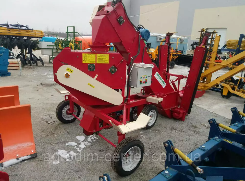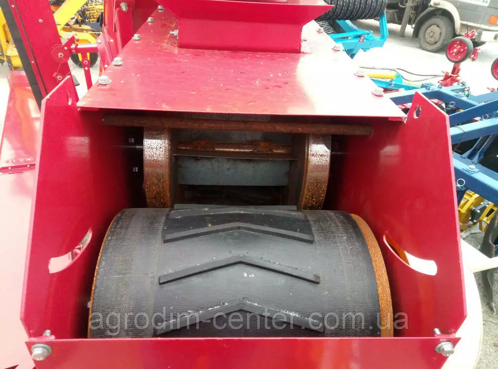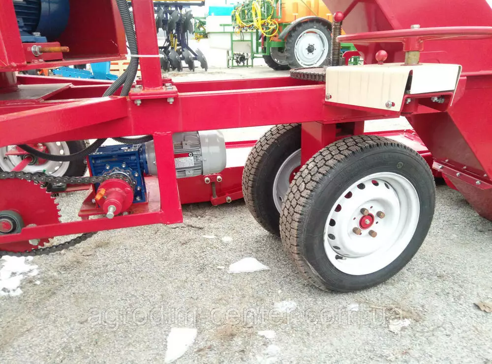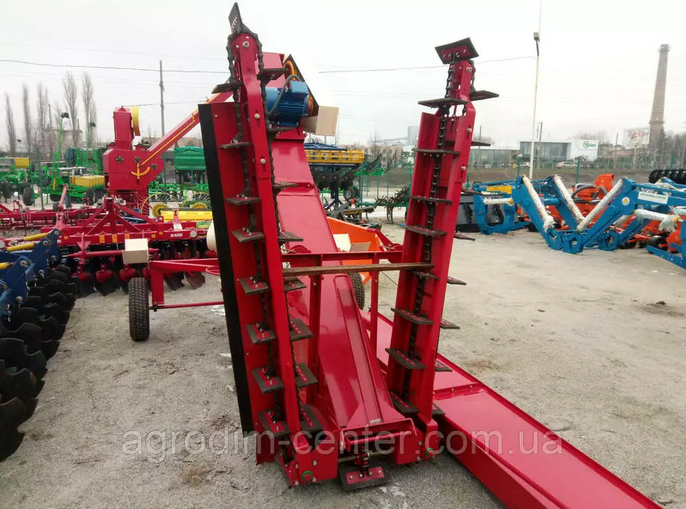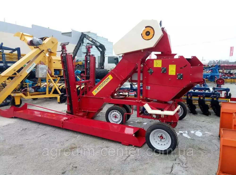 Навантажувач зерна універсальний ПЗУ-110 навантажувач зерна універсальний продуктивністю 110 т / год призначений для механізації вантажно-розвантажувальних робіт на відкритих токах і в зерноскладах. Навантажувач зерна може виконувати наступні технологічні операції: Пристрій і робота машини Характерною особливістю навантажувача є можливість завантаження складів з висотою складування зернового матеріалу до 5,5 м, а також формування високих буртів на відкритих майданчиках струмів з дальністю метання зерна до 25 м. Поворот тріммера на метальника 90 ° в обидві сторони від поздовжньої осі рамі дає можливість забезпечити: - безперервність процесу навантаження зерна в автомашини і в автопоїзда; - розподіл зерна при завантаженні складу; - формування буртів з одним гребенем після двох проходів зернового метальника; - розосередження зерна з буртом для просушування на майданчику струму і формування його (після просушування) знову в бурт. Загальний пристрій. Навантажувач складається з наступних вузлів і механізмів: - рамі з ходовою частиною; - механізму самопересування; - завантажувального транспортера з двома Т-образнорасположеннимі живильниками; - тримера з рамкою поворотною; - електроприводів.
