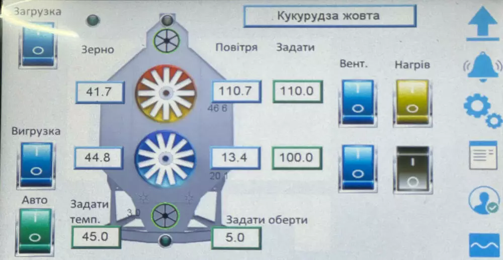 2. Вимірювання температури зерна та агента сушіння проводиться з 6 - і різних точок, дозволяючи отримувати достовірно інформацію про процес сушіння. Датчики температури зерна (4од.), розташовані всередині зернових колон, та 2 датчики температури повітря в камерах нагріву.