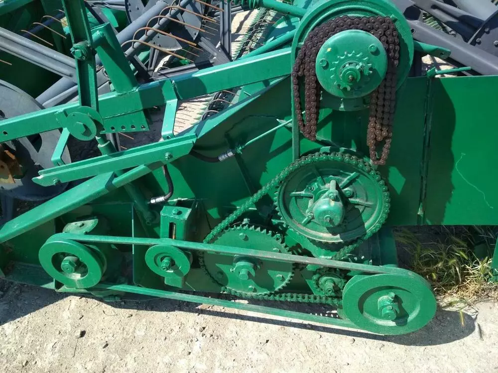 Мотовило подводит порцию стеблей к режущему аппарату. Срезанные стебли транспортируются шнеком к центру жатки, захватываются выдвижными пальцами и перемещаются в наклонную камеру, где наклонным транспортером хлебная масса направляется в молотильный аппарат комбайна.