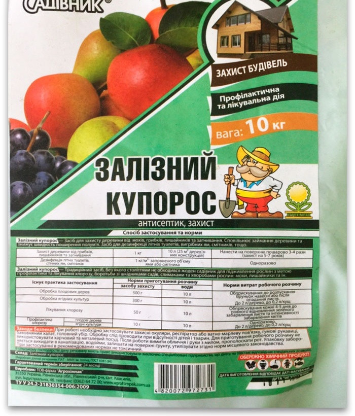 Сульфат заліза (FeSO4 — 53%). Засіб для боротьби з цвіллю, захисту дерев'яних конструкцій від мохов, грибків і грибкових захворювань, лишайників і гнилі. Затруднює загоряння деревини та знижує швидкість поширення полум'я.  Концентрований засіб, який містить залізо в доступній для рослин формі. Класичний фунгіцид (сульфат заліза високої якості), який призначений для боротьби з збудниками хвороб рослин, знищення мохов, лишайників, спор грибків на плодових деревах, ягідних кущах і виноградній лозі до початку та після вегетації. Залізо бере участь в утворенні хлорофілу, тому Залізний купорос є прекрасним засобом для лікування та профілактики хлорозу.