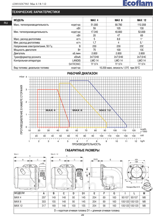 Жидкотопливные дизельные горелки Ecoflam серии MAX 4 MAX 8 MAX 12