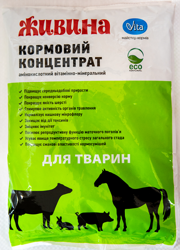 Високоефективна натуральна кормова біодобавка ЖИВИНА - амінокислотний вітамінно-мінеральний кормовий концентрат, що дозволяє швидко вирощувати тварин.