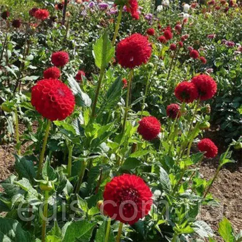 Рясноквітуча жоржина універсального призначення. Квітки середнього розміру, кулеподібні, бадьоро дивляться вгору і в сторони, не никнуть, на довгих квітконіжках, класичне поєднання червоного акценту і жовтого підсвічування. Кущ добре самостійно кущиться, рано зацвітає, стебла міцні, під вагою квіток не хилиться.