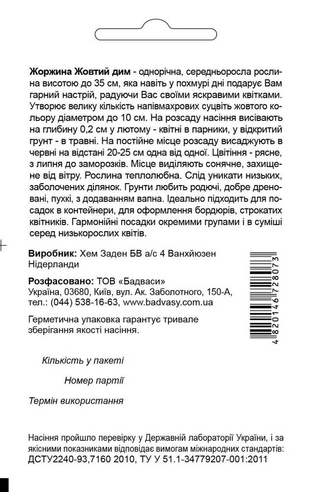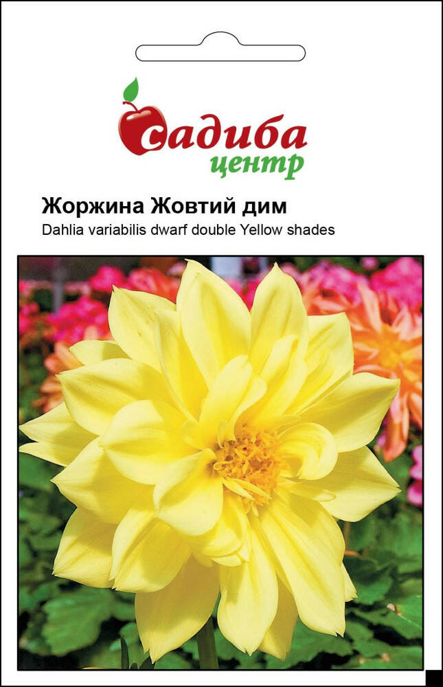 Жоржина Жовтий дим - однорічна, середньоросла рослина висотою до 35 см, яка навіть у похмурі дні подарує Вам гарний настрій, радуючи Вас своїми яскравими квітками. Утворює велику кількість напівмахрових суцвіть жовтого кольору діаметром до 10 см. На розсаду насіння висівають на глибину 0,2 см у лютому - квітні в парники, у відкритий грунт - в травні. На постійне місце розсаду висаджують в червні на відстані 20-25 см одна від одної. Цвітіння - рясне, з липня до заморозків. Місце виділяють сонячне, захищене від вітру. Рослина теплолюбна. Слід уникати низьких, заболочених ділянок. Грунти любить родючі, добре дреновані, пухкі, з додаванням вапна. Ідеально підходить для посадок в контейнери, для оформлення бордюрів, строкатих квітників. Гармонійні посадки окремими групами і в суміші серед низькорослих квітів.