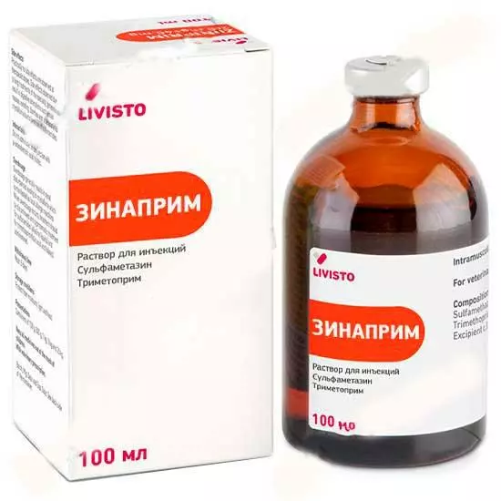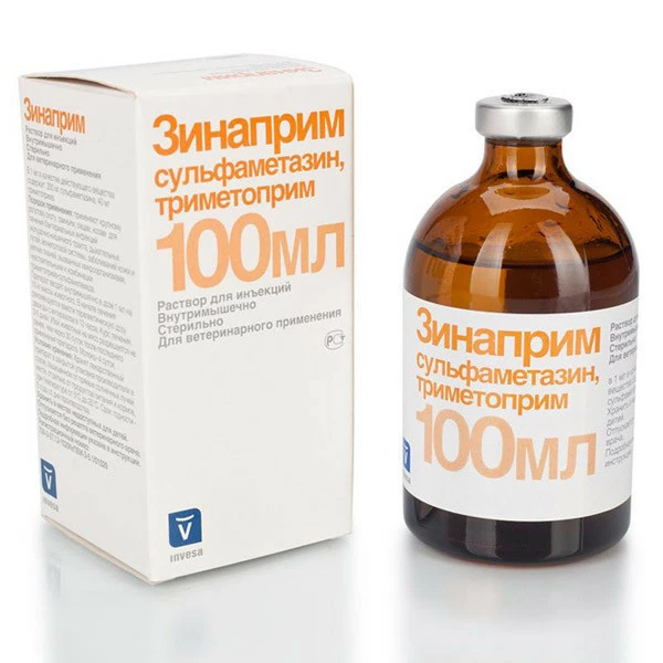 Зінаприм - комплексний антибактеріальний препарат у формі ін'єкційного розчину для лікування великої рогатої худоби, дрібної рогатої худоби при захворюваннях шлунково-кишкового тракту та сечостатевої системи, а також при ураженнях шкіри та м'яких тканин, викликаних мікроорганізмами, чутливими до комбінації сульфаметазин; коней при пневмонії, миті та септикопіємії; лошат при діареї; домашніх тварин при легеневих інфекціях, септицемії, бактеріальному ентериті та цистоізоспорозі собак.