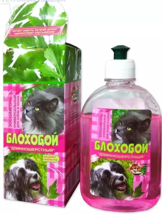 Блохобій "Довгошерстий" - інсектицидний шампунь проти бліх, кліщів у собак і кішок. Знімає подразнення шкіри, спричинене присутністю ектопаразитів. Завдяки добавкам речовин, що зволожують шкіру, придатний для частого застосування. Надає вовни м'якість та здоровий блиск.