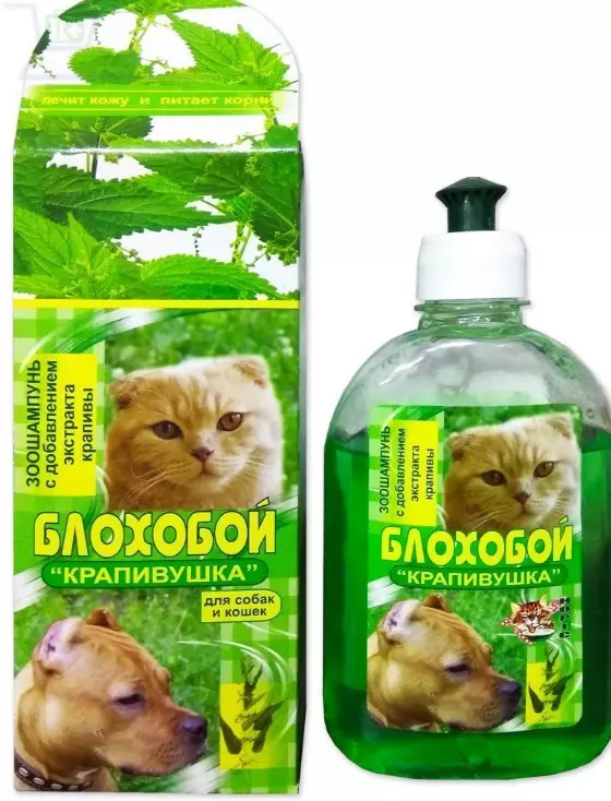 БЛОХОБИЙ "Крапивушка" 200 мл - інсектицидний шампунь проти бліх, кліщів у собак та кішок. Знімає подразнення шкіри, спричинене присутністю ектопаразитів. Завдяки екстракту кропиви, що входить до складу шампуню, усуває свербіж, покращує регенерацію тканин.