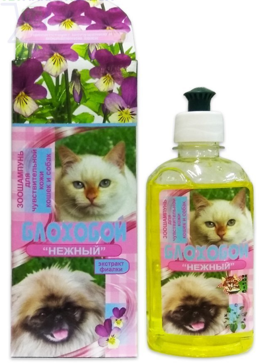 Шампунь БЛОХОБИЙ Ніжний з екстрактом фіалки, 200 мл - інсектицидний шампунь для чутливої ​​шкіри проти бліх та кліщів у собак та котів. Знімає подразнення шкіри, спричинене присутністю ектопаразитів. Завдяки підбору компонентів діє ніжно на шкіру, що дозволяє використовувати шампунь для тварин із чутливою шкірою. Екстракт фіалки, який входить до складу цього шампуню, дбайливо і м'яко доглядає вовну, знімає алергічні запалення, перешкоджає появі нових почервонінь і лущення, впадання вовни. Має зволожуючу та живильну дію на шкіру. Рекомендований для тварин, схильних до алергічних реакцій коштом догляду.