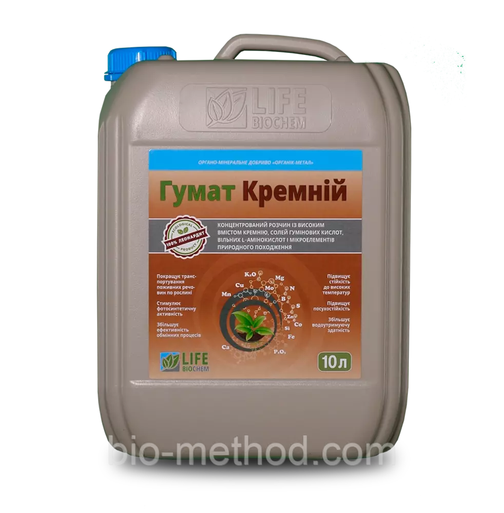 Кремний (SiO2) 60 г/л Соли гуминовых кислот 100 г/л в т. ч. калий (K2O) 30 гСвободные L–аминокислоты 50 г/л, Микроэлементы 10 г/л, Фосфор (P2O5) 60 г/