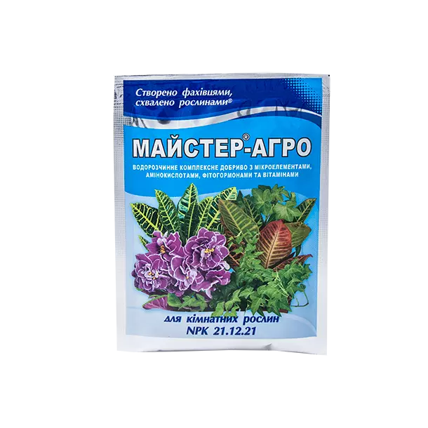 Мастер-Агро для комнатных растений 25 г - эффективное водорастворимое бесхлорное комплексное удобрение с микроэлементами в форме хелатов. Применяется для корневой подкормки при выращивании комнатных балконных и декоративно-лиственных растений.
