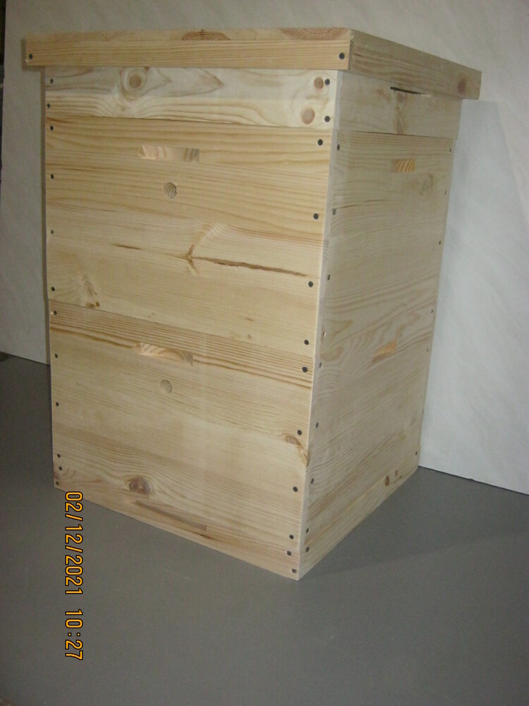 Улей двукорпусный изготовлен из свежепиленой сосны прошедшей низкотемпературную камерную сушку что позволяет избежать выкипание смол и сохранить естественную структуру древесины .Толщина стенок 35 мм.
