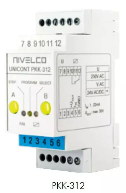 Серия UNICONT PKK–312, концевые выключатели с токовым управлением 4…20 мА и гальванической развязкой, также доступны как искробезопасные устройства. Входные сигналы 4…20 мА могут передаваться с пассивных или активных выходов 2- или 4-проводных датчиков. Значение входного сигнала будет сравниваться в единицах заданного (обученного) значения, а состояние гальванически