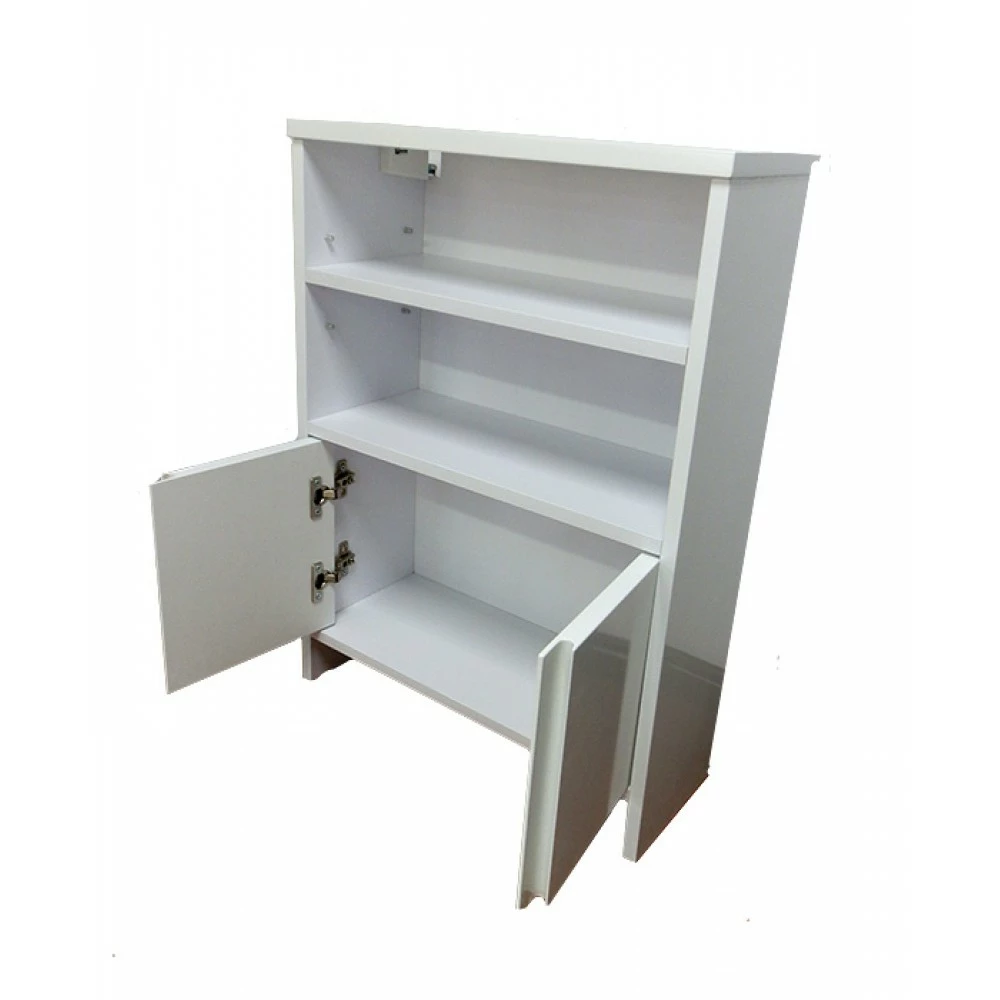 Висота 85 см. Фасад - дверки МДФ корпус виконаний з пластика, висота 70 см. Решта 15 см призначені для рушників. Є 2 поділу встановлені на різній висоті і глибині. Переднє перебувати вище. Заднє - нижче Глибина шафи становить 20 см. Колір - білий сатин (це матовий, чи не глянець).