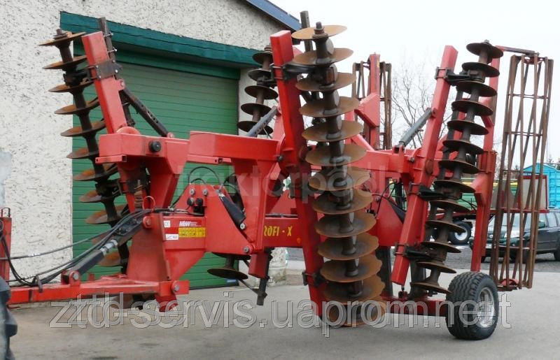 X-образная борона Gregoire Besson. Ширина захвата 6 метров, диски диаметр 660 мм, глубина обработки до 17 см. Вес 6350 кг. Возможно увеличение массы путем закачки жидкости в специально предназначенные для этого резервуары.