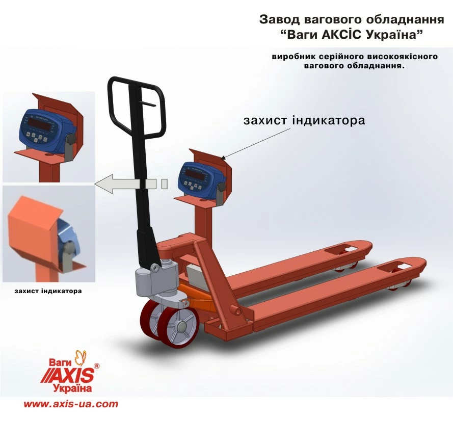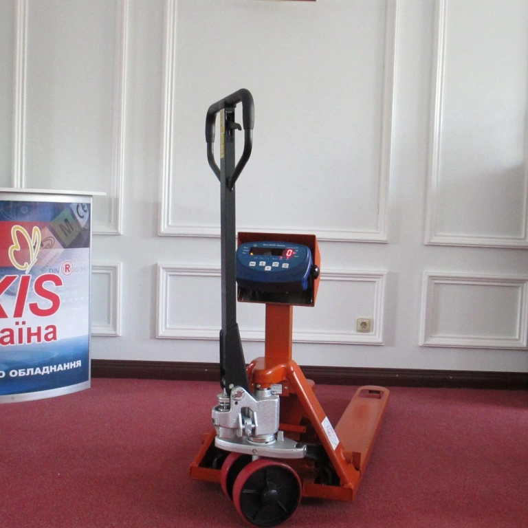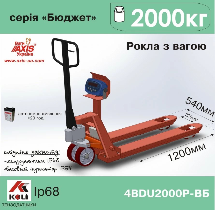 Вага-рокла (рокла з вагою) на 2000кг виробництва Ваги АКСІС Україна моделі 4BDU2000Р-В "БЮДЖЕТ" складається з фінської рокли Rocla (ДОВЖИНА ВИЛ 1200мм, розмір роликів Ø82х70мм, розмір рульових коліс Ø200х50мм, матеріал рульових коліс чавун-поліуретан, висота підйому вил 200мм), чотирьох тензометричних датчиків з класом захисту IP68, комутаторної коробки та вагопроцесора AXIS-01 (висота цифр 18мм, LED, IP54).  Автономне живлення~20год.