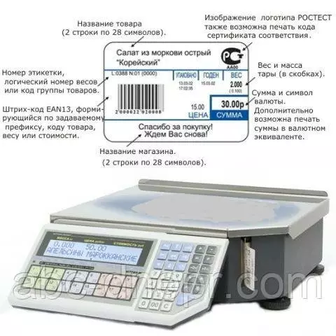 Кроме этих данных, на этикетке также возможно отобразить текстовое сообщение от 4 до 30 строк по 50 символов, изображения 3 и 4, код товара, номер ПЛУ товара, массу брутто, расчетную массу нетто, пользовательские тексты 1..5 по 30 символов и другие данные, подробнее см.. Все текстовые данные могут быть отображены любым из встроенных семи шрифтов. Дизайн этикетки можно разработать с помощью программы из комплекта поставки весов.