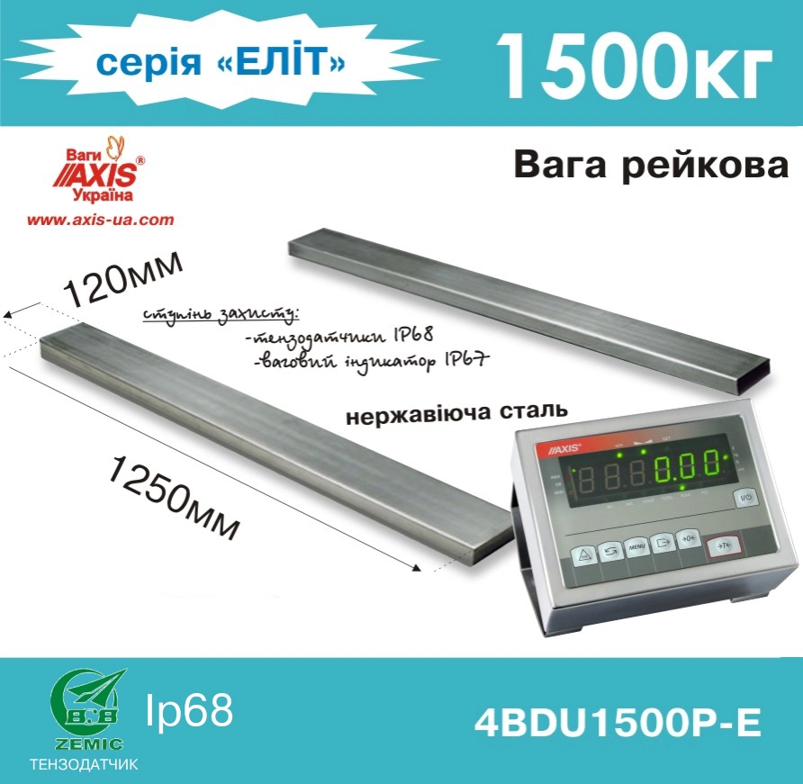 Ваги рейкові виробництва Ваги АКСІС Україна серії 4BDU..Р "ЕЛІТ" складаються з двох нержавыючих вантажоприймальних рейок, 4-х тензометричних датчиків з класом захисту ІР68 (Vishay Tedea-Huntleigh, Zemic), комутаторної коробки та вагопроцесора ME-01/N/18/RS/VK (висота цифр 18 мм, LED, корпус виконаний з нержавійки, клас захисту  ІР67) фірми "AXIS". Відрізняються винятковою надійністю, зручністю, стабільністю показів та простотою в користуванні і характеризуються відмінними технічними характеристиками та функціональними можливостями.