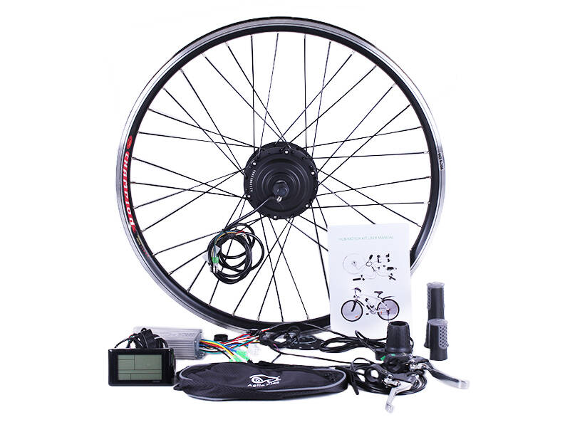 Элементы набора готовы к монтажу. Устанавливаются легко и без проблем с посадочными местами и трещотками. Собранное и заспицованное колесо с электродвигателем 36v 350w, ставится на переднюю или заднюю ось велосипеда (в зависимости от комплекта). Крепкий обод с усиленными спицами защищает мотор от деформации, вынослив и стойкий к нагрузкам.