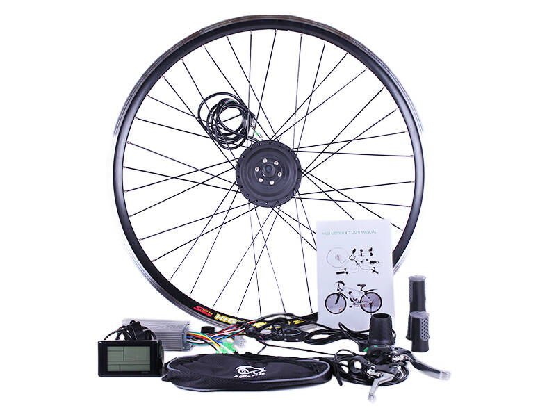 Элементы набора готовы к монтажу. Устанавливаются легко и без проблем с посадочными местами и трещотками. Собранное и заспицованное колесо с электродвигателем 36v 350w, ставится на переднюю или заднюю ось велосипеда (в зависимости от комплекта). Крепкий обод с усиленными спицами защищает мотор от деформации, вынослив и стойкий к нагрузкам.