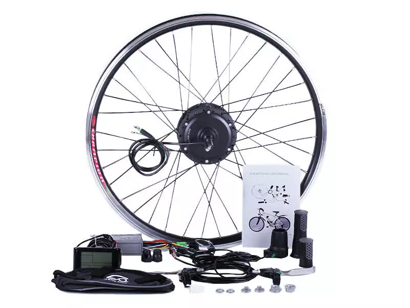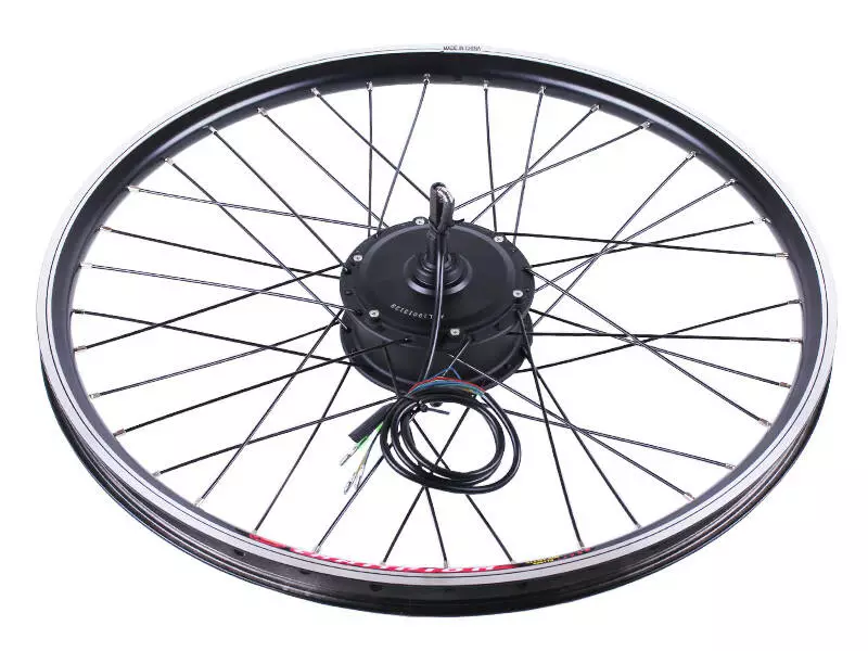Элементы набора готовы к монтажу. Устанавливаются легко и без проблем с посадочными местами и трещотками. Собранное и заспицованное колесо с электродвигателем 36v 350w, ставится на переднюю или заднюю ось велосипеда (в зависимости от комплекта). Крепкий обод с усиленными спицами защищает мотор от деформации, вынослив и стойкий к нагрузкам.