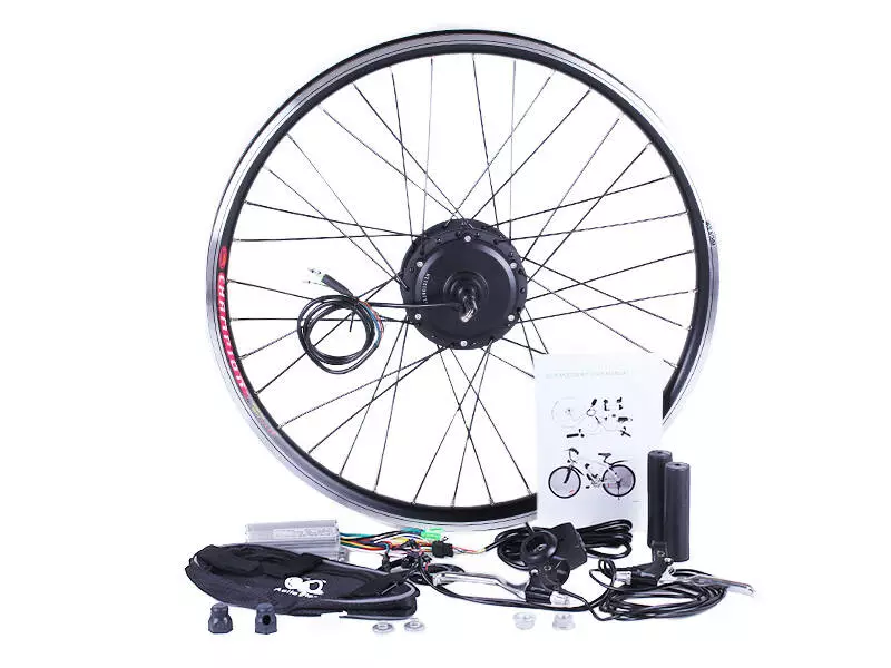 Элементы набора готовы к монтажу. Устанавливаются легко и без проблем с посадочными местами и трещотками. Собранное и заспицованное колесо с электродвигателем 36v 350w, ставится на переднюю или заднюю ось велосипеда (в зависимости от комплекта). Крепкий обод с усиленными спицами защищает мотор от деформации, вынослив и стойкий к нагрузкам.
