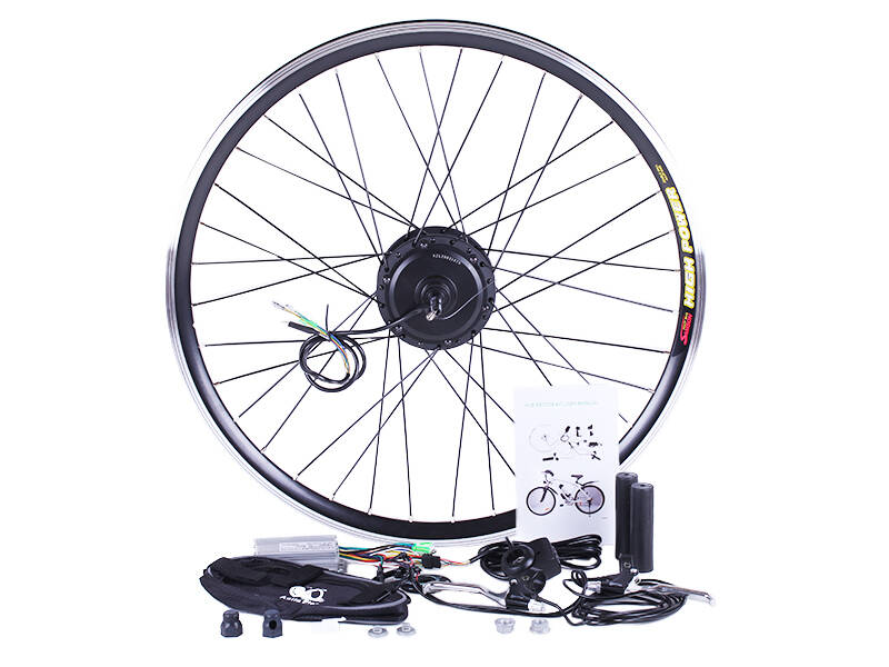 Элементы набора готовы к монтажу. Устанавливаются легко и без проблем с посадочными местами и трещотками. Собранное и заспицованное колесо с электродвигателем 36v 350w, ставится на переднюю или заднюю ось велосипеда (в зависимости от комплекта). Крепкий обод с усиленными спицами защищает мотор от деформации, вынослив и стойкий к нагрузкам.