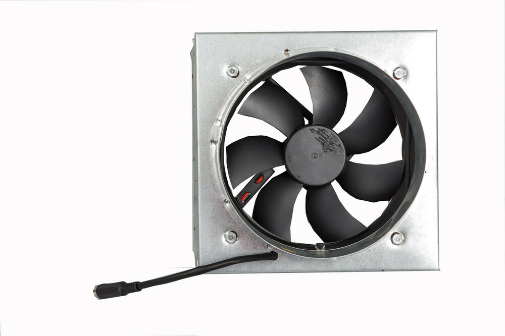 Вертушка вентилятора, подключенного в сеть, значительно повышает эффективность циркуляции нагретого воздуха из воздушных каналов, идущих от короба камина в жилые помещения. Он распространяет теплый воздух даже в отдаленные помещения.