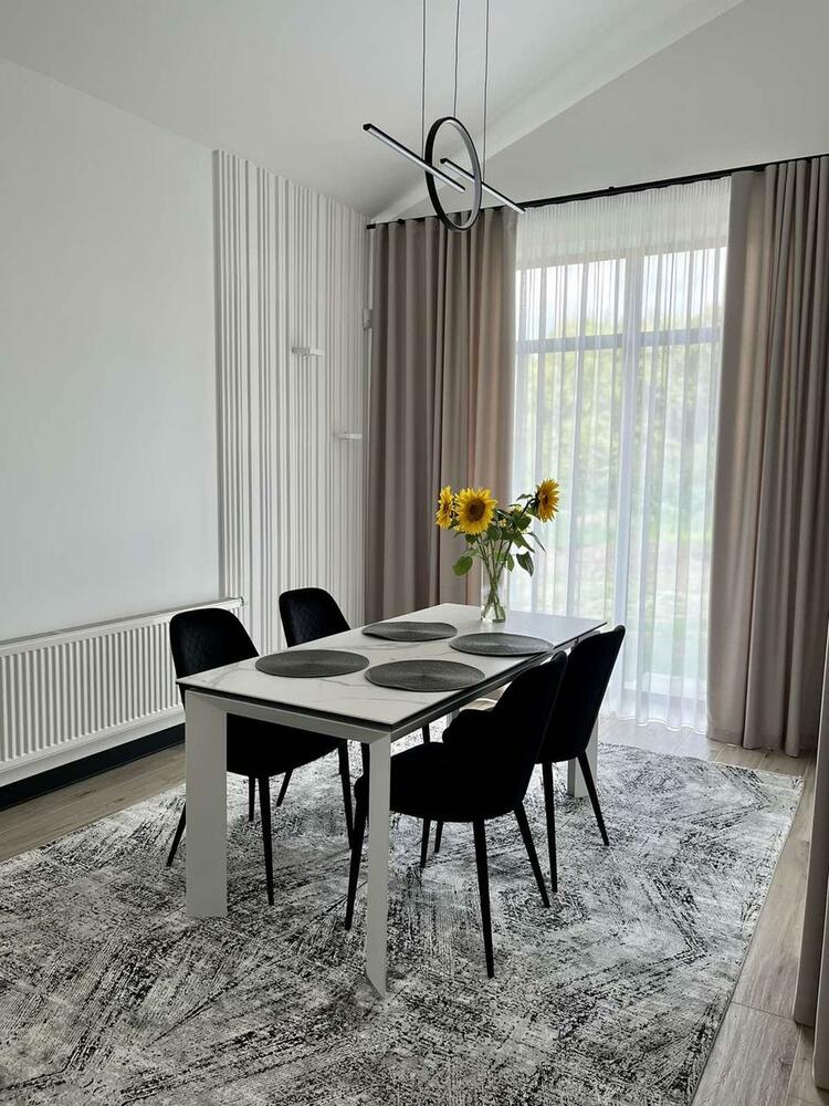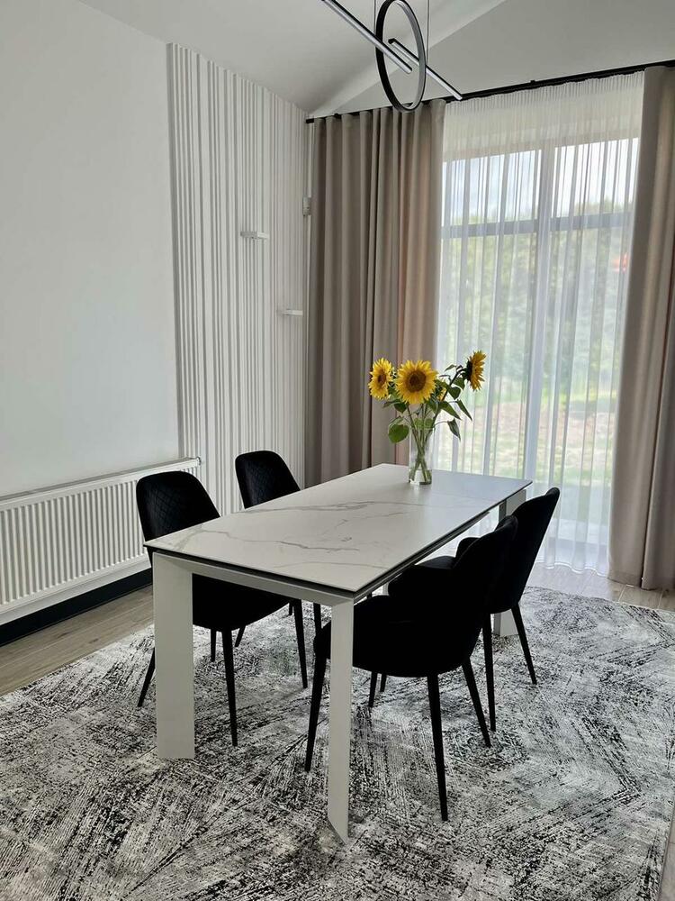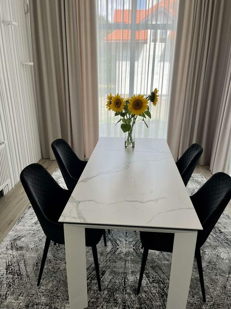 В сложенном состоянии стол рассчитан на 6 персон, с дополнительной панелью – на 8. Дополнительная вставка, расположенная сбоку, позволяет при необходимости увеличить стол на 50 см. Раздвинуть стол очень просто: нужно потянуть дополнительную панель на себя, выдвинуть и поднять её. В ножки стола со стороны вставки встроены мини-колёсики, которые облегчают процесс трансформации.