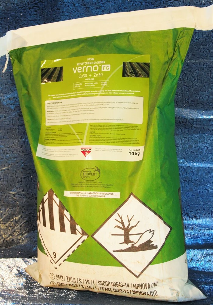 Verno FG Cu30 + Zn30 соответствует международному сертификату OMRI (Organic Materials Review Institute - Институт органических материалов). Применение продуктов, включенных в список OMRI, позволяет предприятиям получить сертификат органического производства.