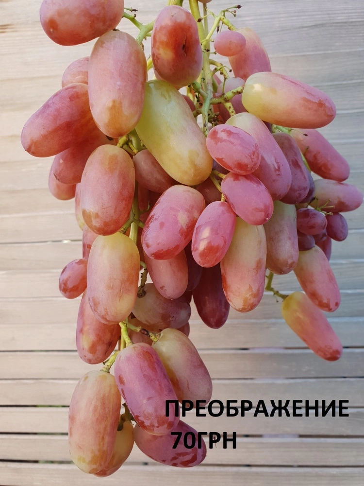 Преображение – гибридная форма винограда любительской селекции, очень раннего срока созревания. В условиях г.Новочеркасска созревает в первой декаде августа. Куст очень большой силы роста с очень высокой пасынкообразовательной способностью. Цветок обоеполый. Грозди конические или бесформенные, средней плотности, иногда рыхлые, массой 700-1500 г. Ягоды удлиненно-овальные, очень крупные, средней массой 13,9 г, розовые, гармоничного вкуса. Мякоть сочно-мясистая, кожица средней толщины. Сахаристость сока ягод 17-19 г/100 см3, кислотность 6-7 г/дм3. Побеги вызревают удовлетворительно. Устойчивость грибным болезням на уровне 3,5-4 балла, требует обязательного укрытия кустов на зиму. Транспортабельность и товарность очень высокая. Форма способна давать второй полноценный урожай на пасынках. Идеальное решения для выращивание ягоды на реализацию.