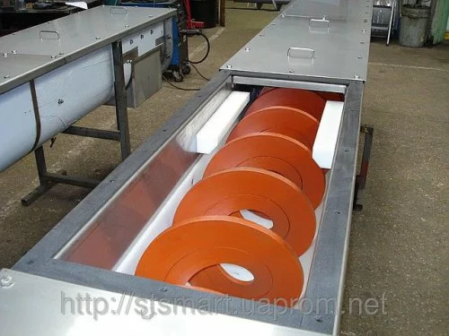 Винтовой конвейер или как его еще называют шнековый конвейер имеет принципиально отличную конструкцию от ленточного конвейера или рольганга. Транспортировка грузов в винтовом транспортере происходит посредством вращения архимедова винта (шнека) по желобу.