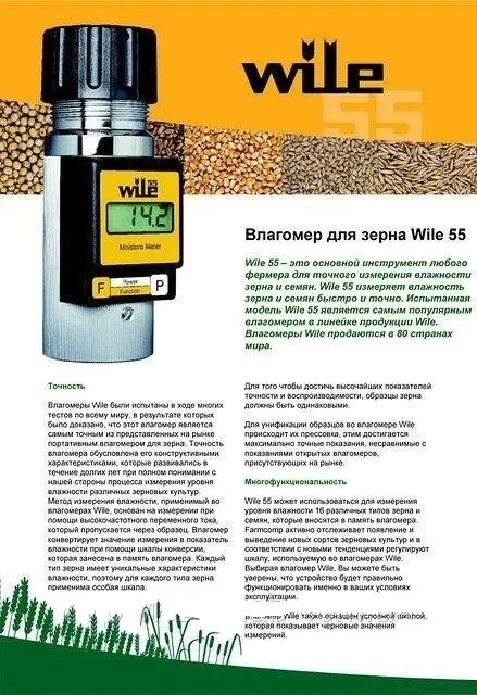 Влагомер WILE- 55 (производство Farmcomp Финляндия) предназначен для экспресс — измерения влажности зерновых, зернобобовых и масленичных культур, а также продуктов их переработки. Используется для измерения влажности цельных зерен и семян. Содержание влаги в измеряемой массе отображается на LCD-дисплее в процентах веса.
