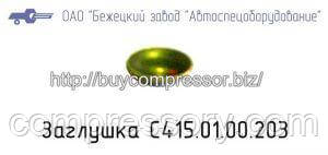 Заглушка С415.01.00.203, компрессора ГСВ-0,6/12; ГСВ-1/12; 155-2ВУ4; 1101-В5У4; 155-2В5У4; 110-2Ву4 производства СССР, АО «Бежецкого завода АСО» и на компрессорах Артёмовского завода, начиная с 1960 г. и заканчивая 1989 г. Устанавливается в отверстии поршневого пальца на поршне высокого давления, изготавливается из бронзы методом штамповки, имеет сферическую форму. Предотвращает выскальзывание поршневого пальца из поршня чем уберегает цилиндр от царапин и задиров. Также подходит для компрессоров С415М; С416М.