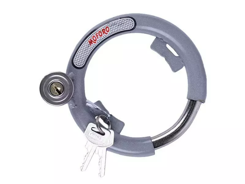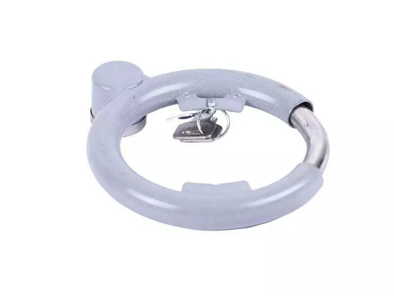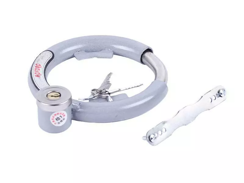 Его крепкая конструкция изготовлена из прочного металла, что делает его устойчивым к различным методам взлома. Состоит из корпуса, запорной дужки и секретного механизма с двумя ключами в комплекте. Для крепления к раме используется специальная скоба. Установленный на раму замок блокирует вращение колеса, препятствуя тем самым свободное перемещение транспортного средства.