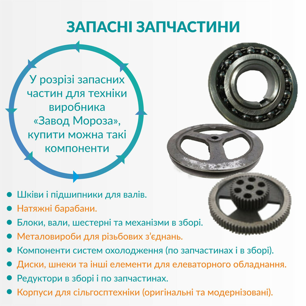 - Витратні матеріали (щітки, повзуни, скребки, ланцюги, шайби, втулки, підшипники, ремені);