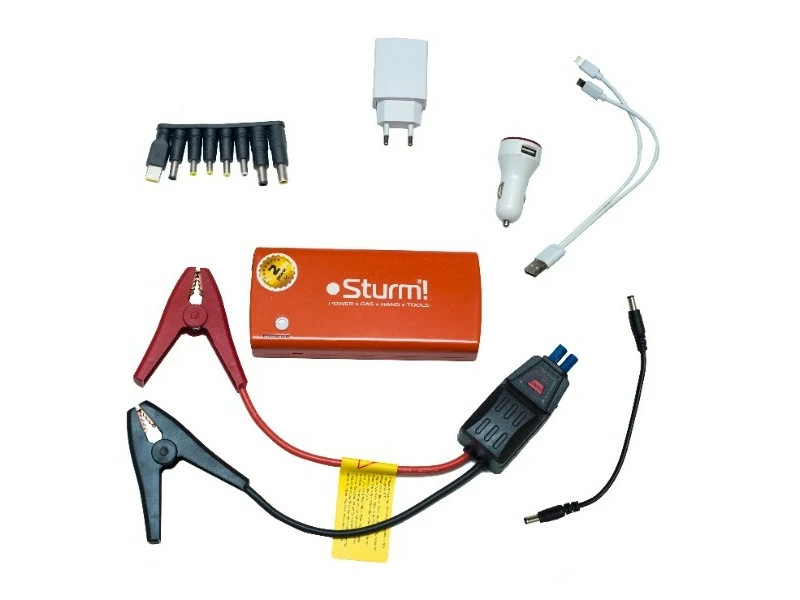 Пусковое устройство Sturm BC1214; Зарядное устройство 100-240В переменного тока - 1 шт; Зарядное устройство постоянного тока 12В - 1 шт; Клеммы Smart Clamp - 1 шт; USB кабель - 1 шт; Комплект переходников для зарядки ноутбуков. Инструкция по эксплуатации - 1 шт;