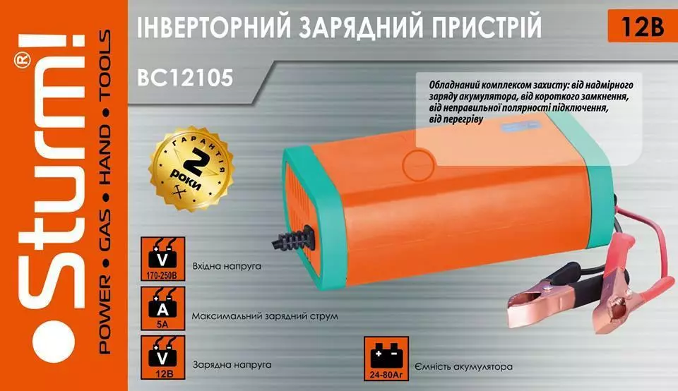 Чтобы зарядить стартерные 12-вольтные батареи, ёмкостью 24 — 80 Ач, в автоматическом режиме, используется зарядное устройство инвертного типа Sturm BC12105.