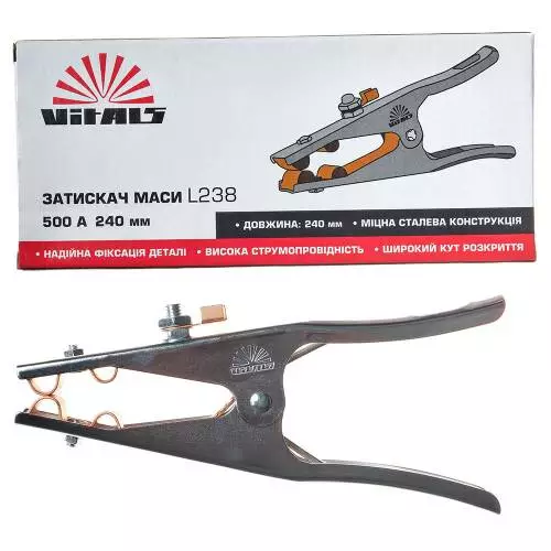 Затискач маси Vitals L238 500A — це необхідний аксесуар для проведення зварювальних робіт. Основна функція затискача — надійне з’єднання джерела живлення та деталі, що зварюється завдяки міцній конструкції в поєднанні з потужною пружиною.