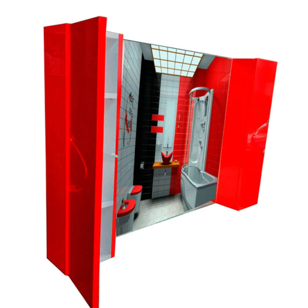 Зеркало для ванной Maranella. Зеркало выполнено в ярком красном цвете. Встроены по 2 полочки для ванных вещей. Так же установлена система PUSH открытия.Корпус - МДФФасад - МДФШирина - 120 см.Высота - 80 см.Глубина - 17 см.