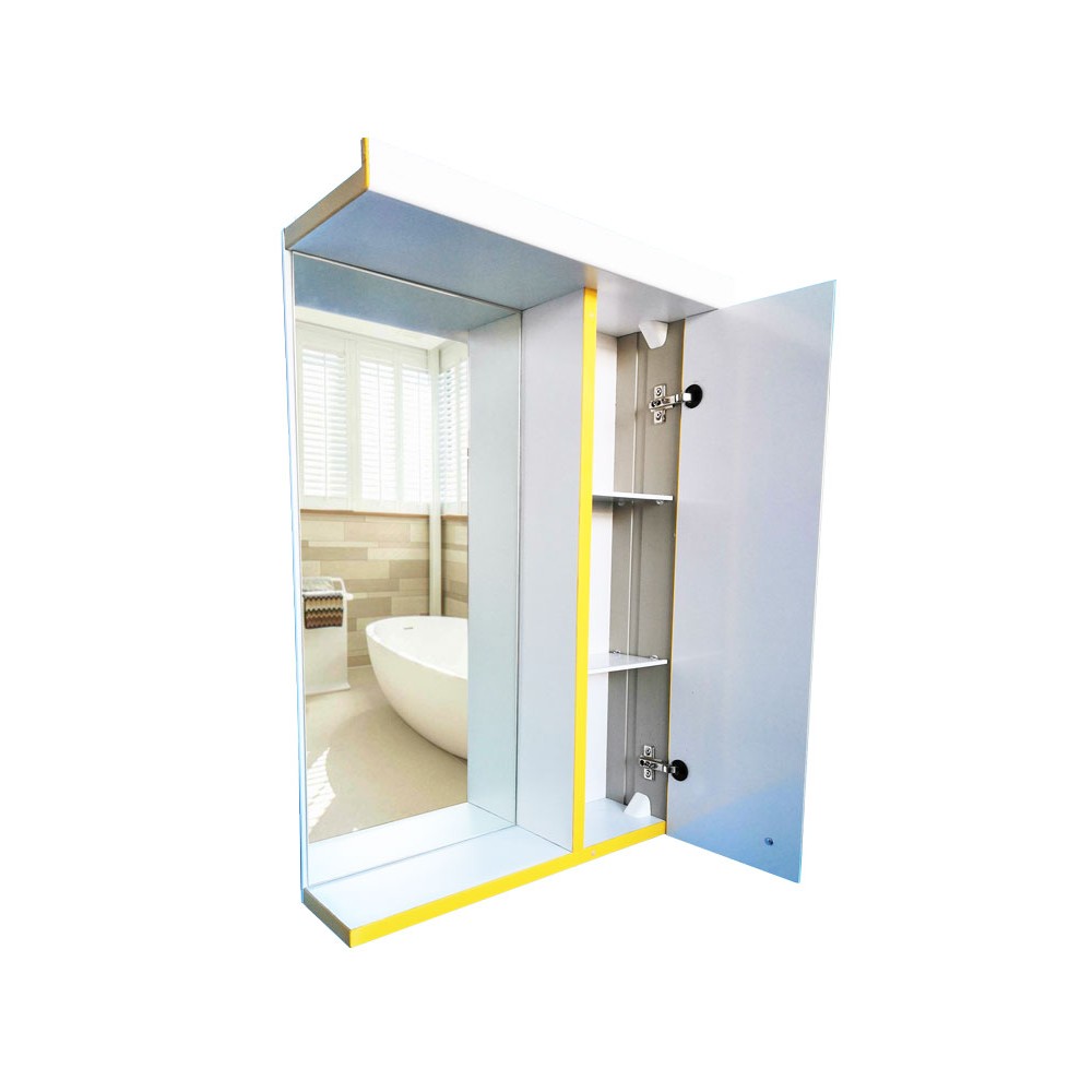 Практичным хозяевам нужна практичная, надежная, долговечная мебель. Зеркало с двумя полочками. Высота зеркала составляет 70 см. Глубина - 12 см. Корпус изготовлен из пластика цвета белый сатин. Торцы окантованы желтым пластиковым кантом.В этом  зеркале в ванную комнату сочетается все лучшее, что только можно представить: практичный пластиковый корпус, устойчивость к влаге, зеркальный фасад. То есть зеркало и есть дверь. Есть 2 полочки, которые делят пространство на 3 части. Нижнее пространство составляет 25 см. Выше 2 пространства по 18 см. На полочках можно разместить много косметических средств, встанет даже высокая бутылочка с шампунем.Кроме основных параметров мы предусмотрели дополнительные функции - возможность установки точечной или ленточной подсветки и подогрев. Ленточный LED светильник чуть меньше зеркального полотна. Подсветка расположенная под козырьком зеркала обеспечит дополнительное освещение для нанесения более точного макияжа или выполнения процедуры бритья. Подогрев зеркал является новинкой и используется для предотвращения запотевания зеркал.