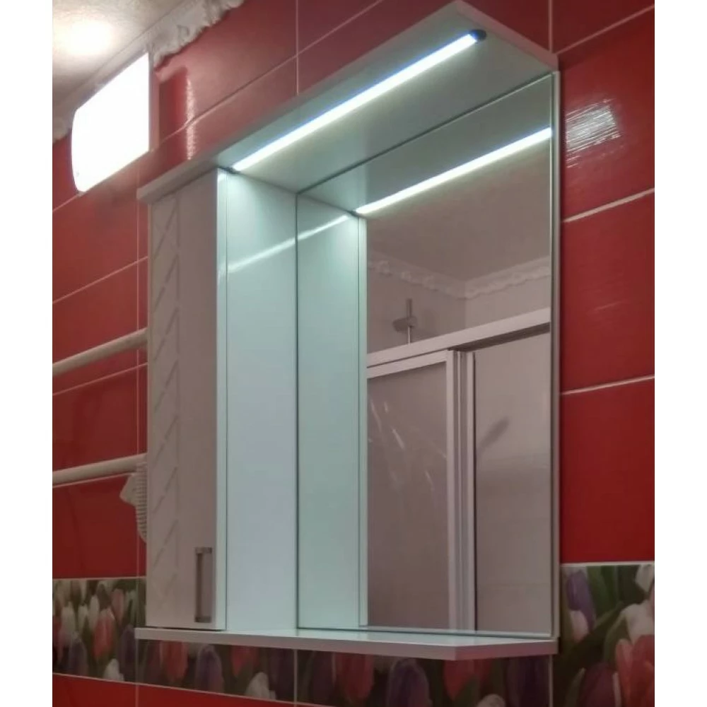 Фасад зеркала выполнен из окрашенного МДФ, 4 слоя-покрытия, соблюдены все технические правила. Фрезерованный ненавязчивый узор добавит элегантности вашей ванной комнате. Горизонтальная полочка для быстрого доступа к баночкам и тюбикам. Ну, а на полочках за дверцой можно спрятать все семейные средства гигиены.Корпус изготовлен из пластика и композита.Подсветка зеркала пригодится женщинам и мужчинам. Для более точного нанесения макияжа или во время бритья.