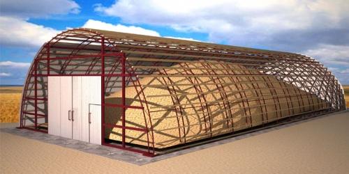 Тип хранения – напольное. Зерно располагается на полу, а наполняют ангар горизонтально и под наклоном, опирая на стены до 2-х м. Если нужно, в таких ангарах можно поставить механизмы погрузки и разгрузки.