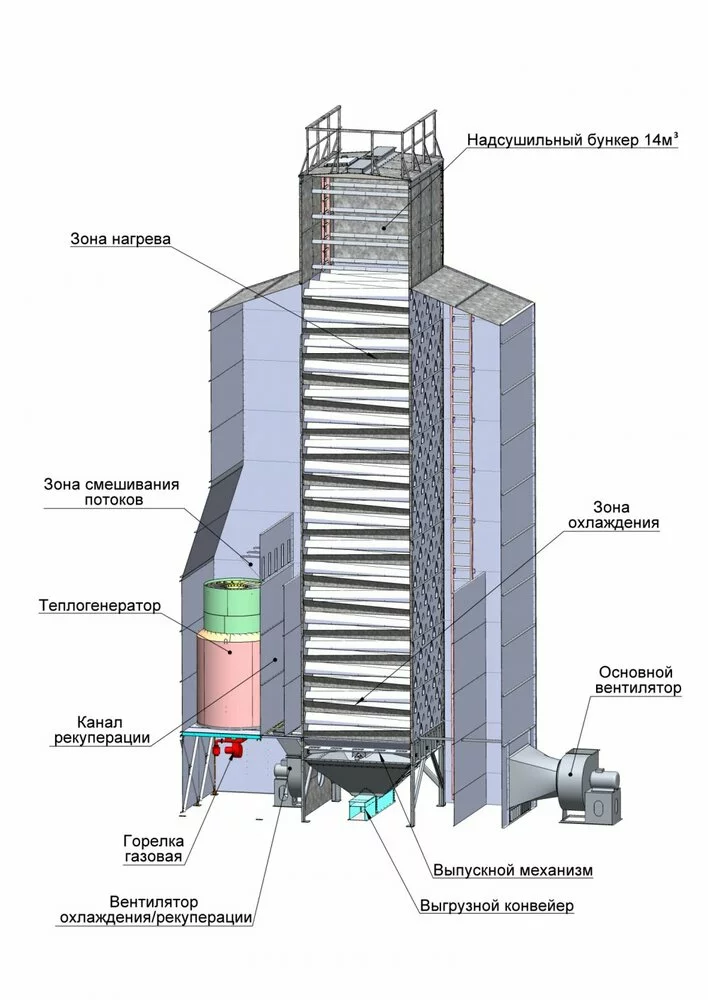 Зерно, перемещаясь сверху вниз, проходит между коробами, нагревается и сушится, а после прохождения всех секций зоны нагрева поступает в охлаждающие секции. Там зерно охлаждается атмосферным воздухом почти до температуры окружающей среды. После охлаждения зерно попадает в выпускной механизм.