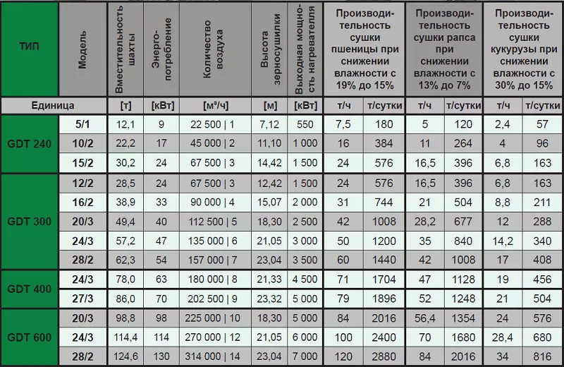 4. Данные производительности верны при условиях: температура окружающей среды + 15 ° С, влажность воздуха 75%, зерно чистое, биологически зрелое, бесперебойная работа сушилки.
